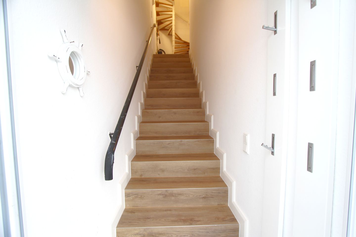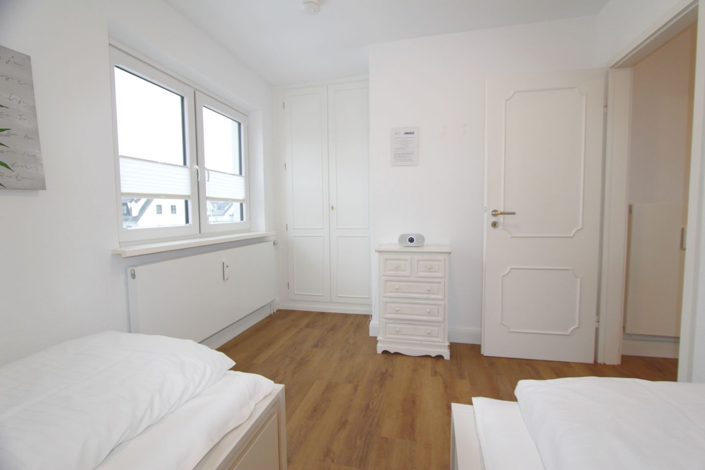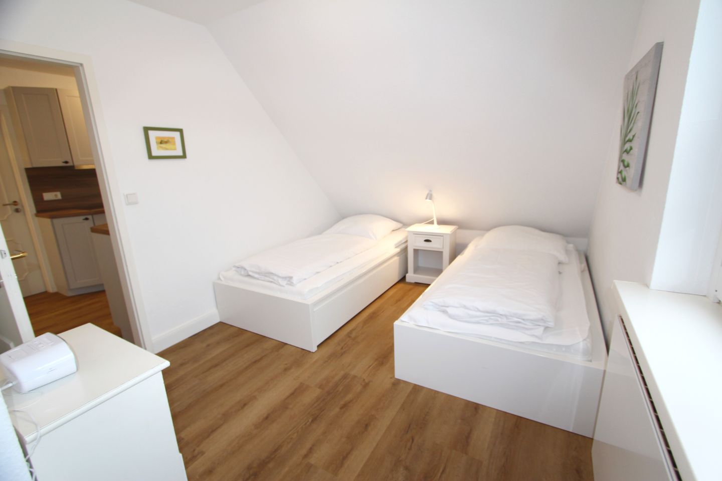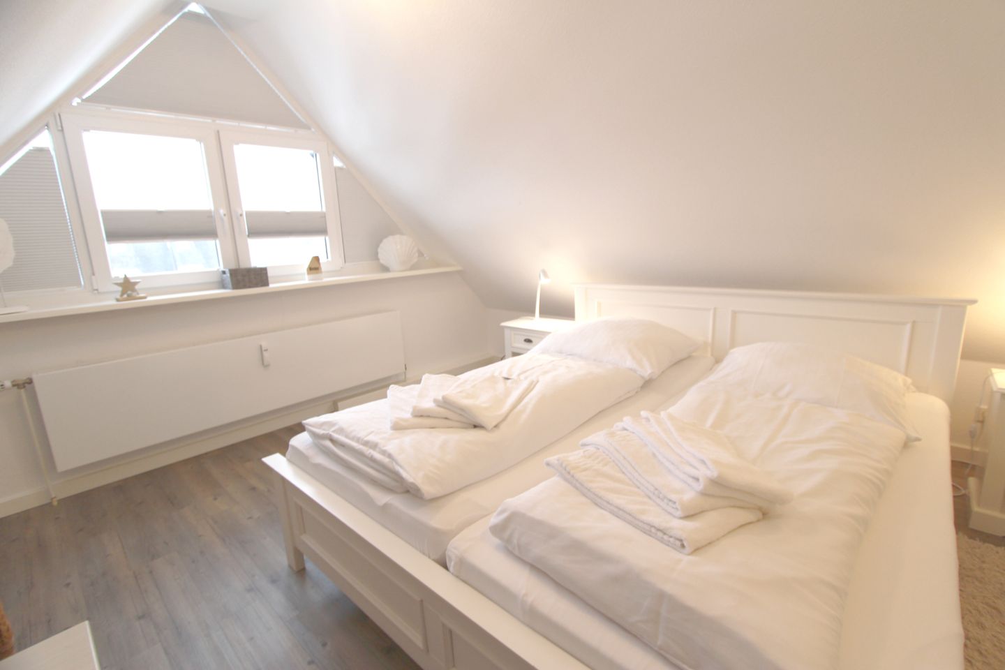 Im Obergeschoss auf einer Ebene mit Wohn- und Essbereich befindet sich ein Schlafzimmer mit zwei gemütlichen Einzelbetten. Darüber hinaus schlafen Sie im Dachgeschoss, das über eine Wendeltreppe zu erreichen ist, in einem komfortablen Doppelbett. Der Raum im Dachgeschoss ist durch eine Giebel-Fensterfront lichtdurchflutet.