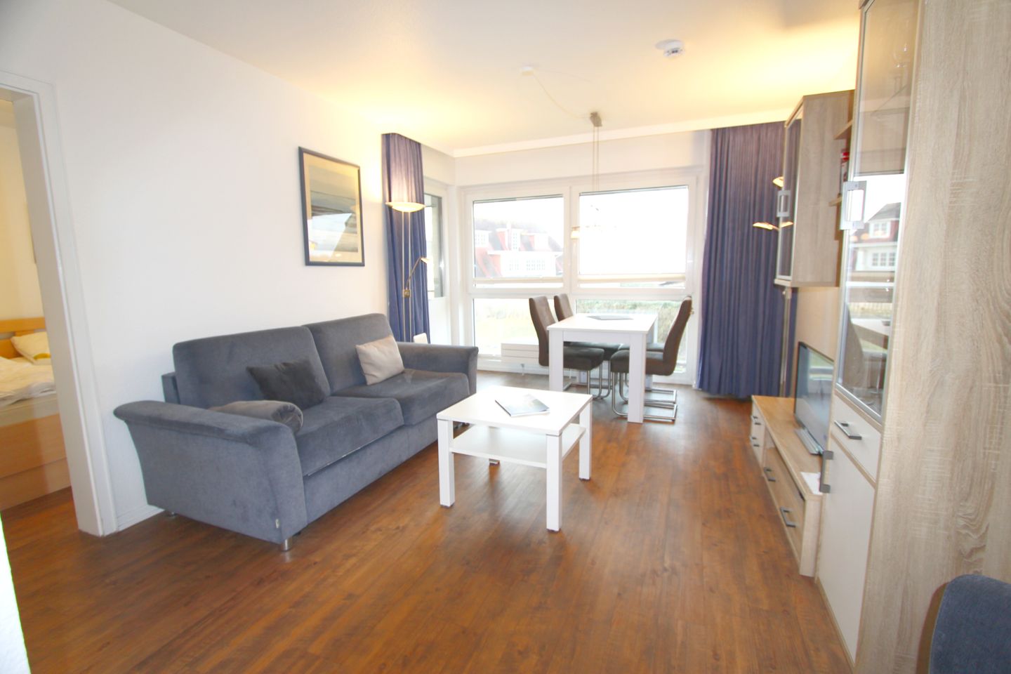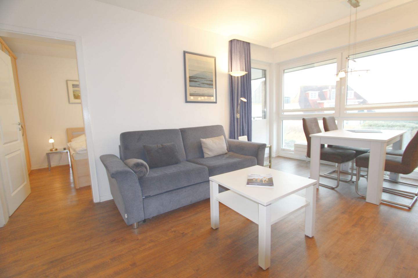 Träumen Sie im separaten Schlafraum mit Doppelbett und großer Fensterfront. Im großzügigen Kleiderschrank verstauen Sie Ihr Reisegepäck. Eine Doppelschlafcouch befindet sich im Wohnzimmer.