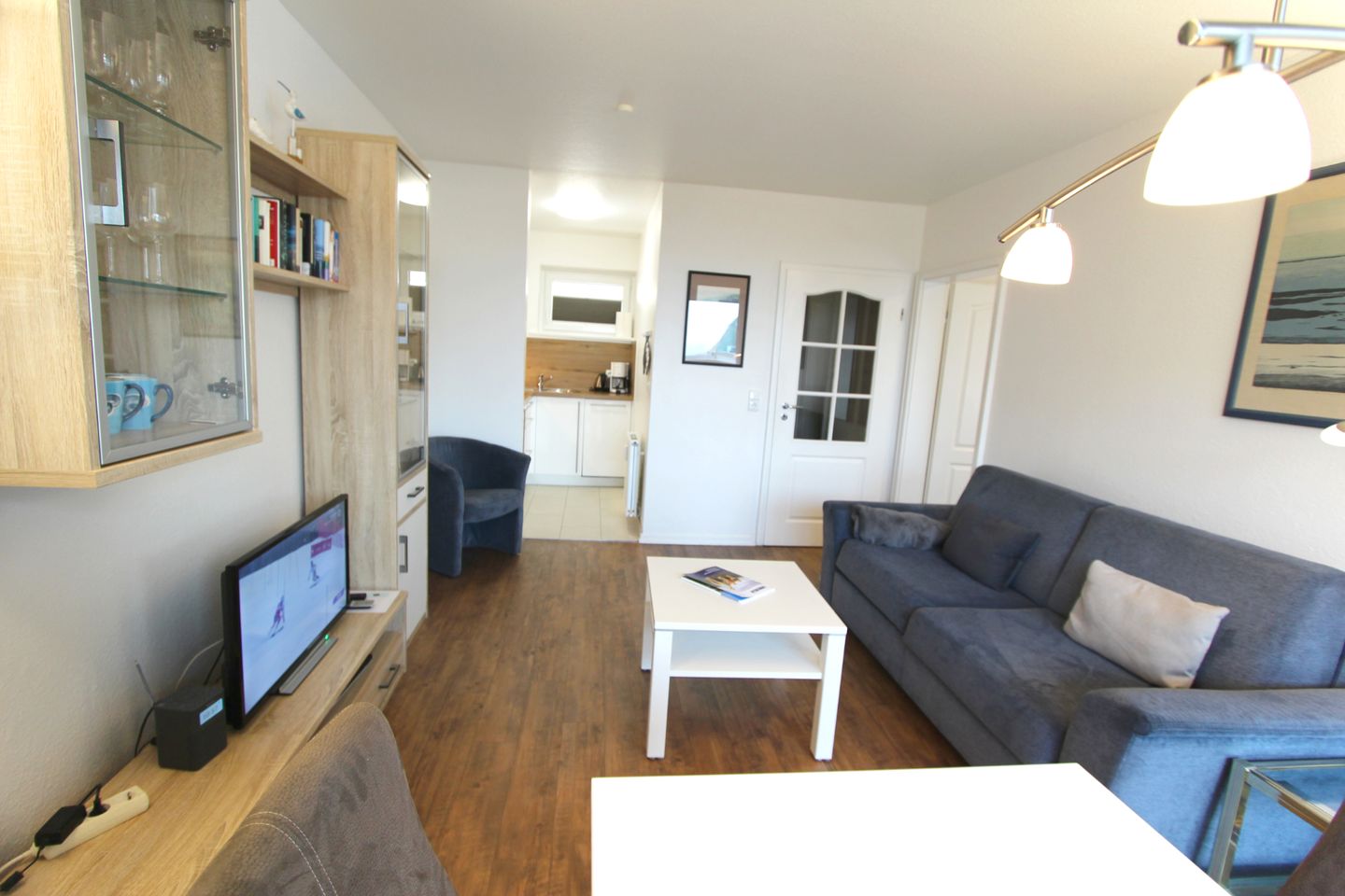 Der separate Küchenbereich bietet ausreichend Platz für das Zubereiten von Speisen und Getränken. Direkt an der großen Fensterfront gelegen liegt der helle Essensplatz mit Blick auf die Nordsee.