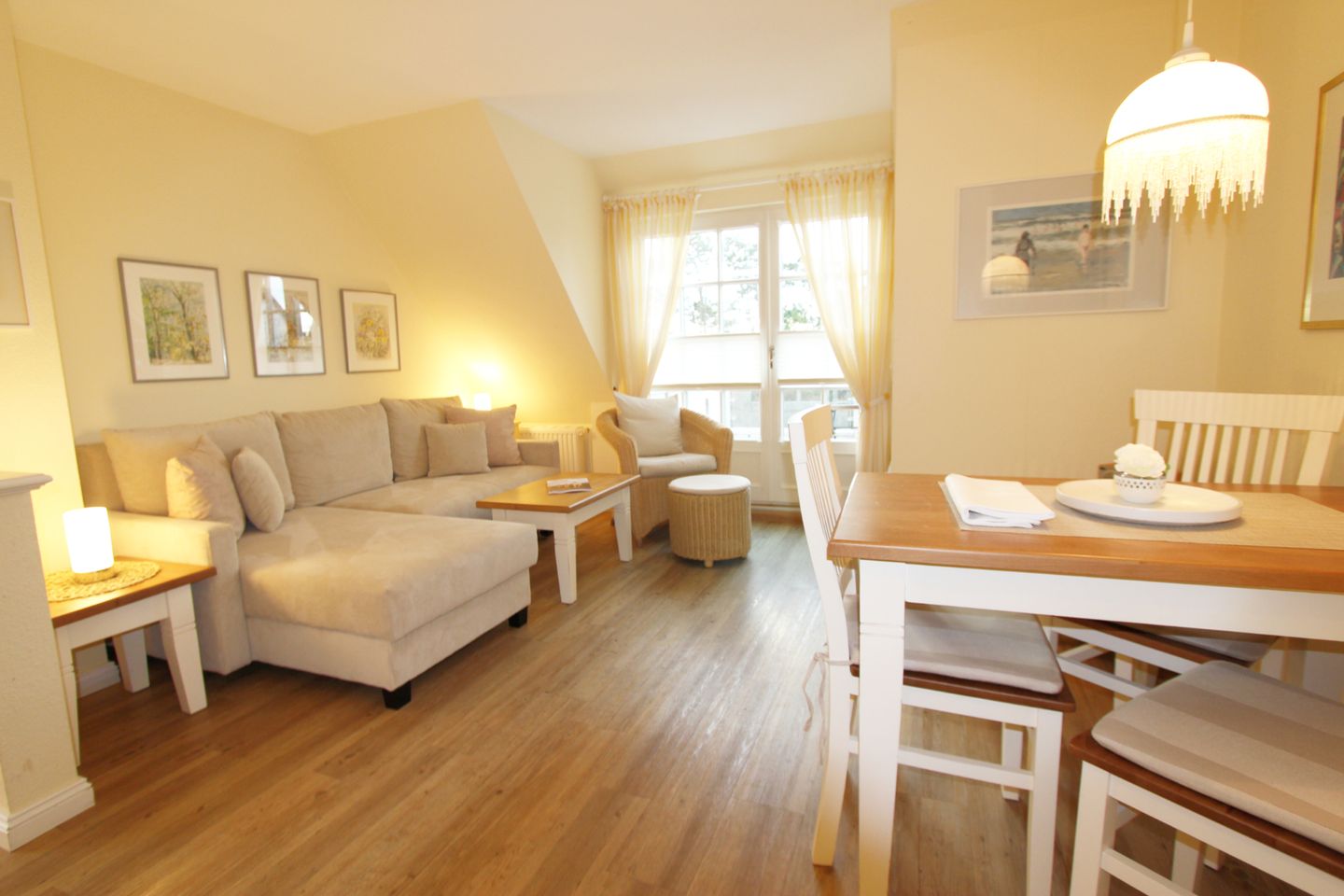 Der geschmackvolle Schlafraum liegt im Dachgeschoss und bietet ein komfortables Doppelbett mit durchgehendem Topper (180 x 200 cm). Durch die helle Farbgebung fühlen Sie sich direkt wohl.