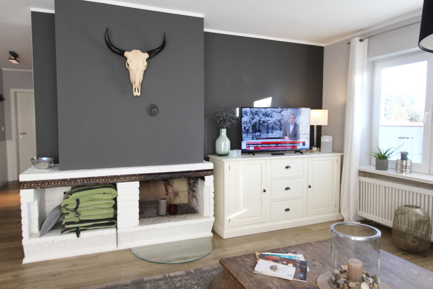 Der großzügige Wohnbereich im Erdgeschoss sorgt mit einer bequemen Sofagarnitur und Deko-Kamin (ohne Funktion) für eine angenehme Wohlfühlatmosphäre.