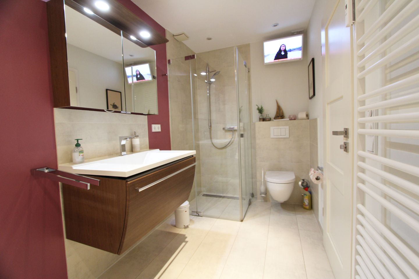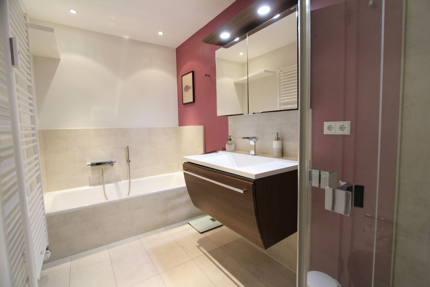 Das Badezimmer mit Dusche und Badewanne bietet viel Platz und Komfort. Hier können Sie den Sand und das Salz nach einem sonnigen Strandtag von der Haut waschen. Besonderes Highlight ist ein Fernseher, den Sie von der Badewanne aus im Blick haben. Waschmaschine und Trockner stehen Ihnen im Gemeinschaftskeller zur Verfügung.