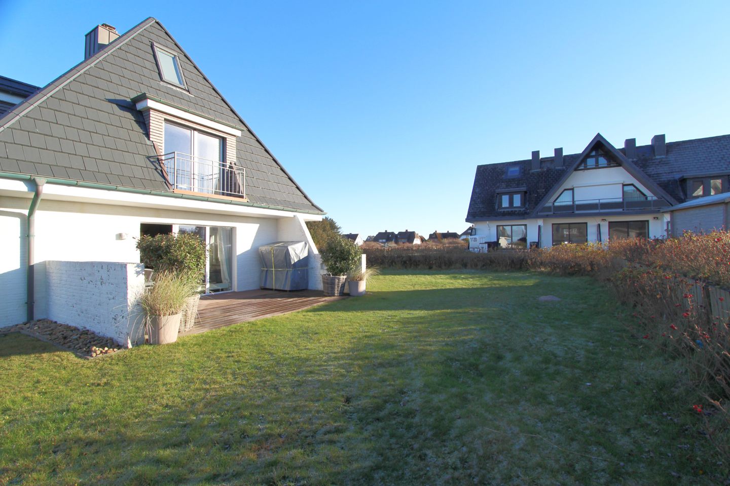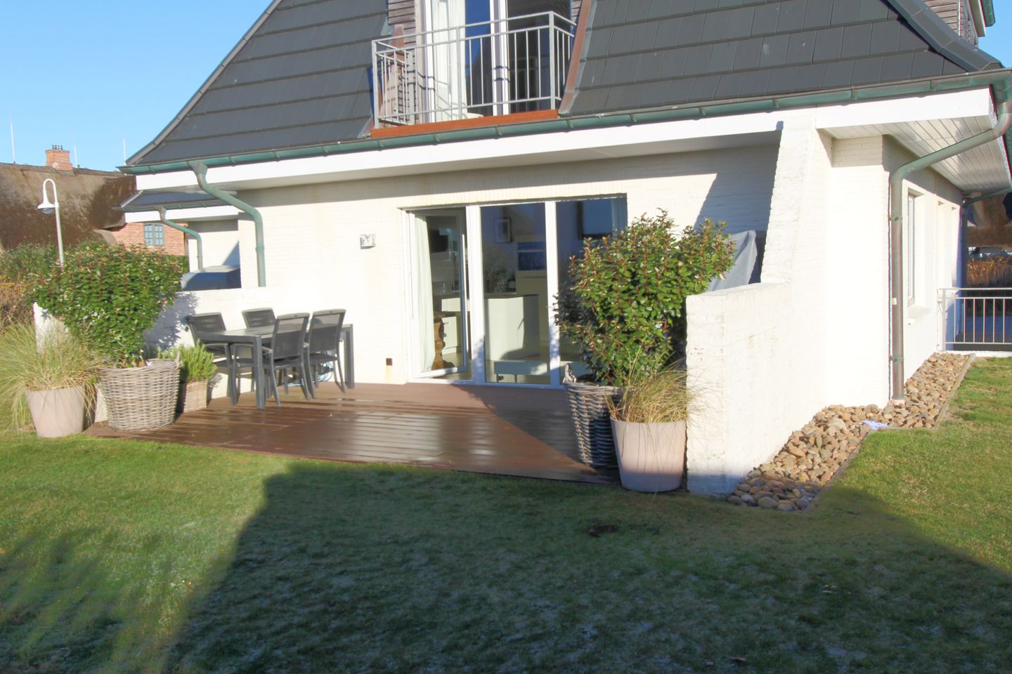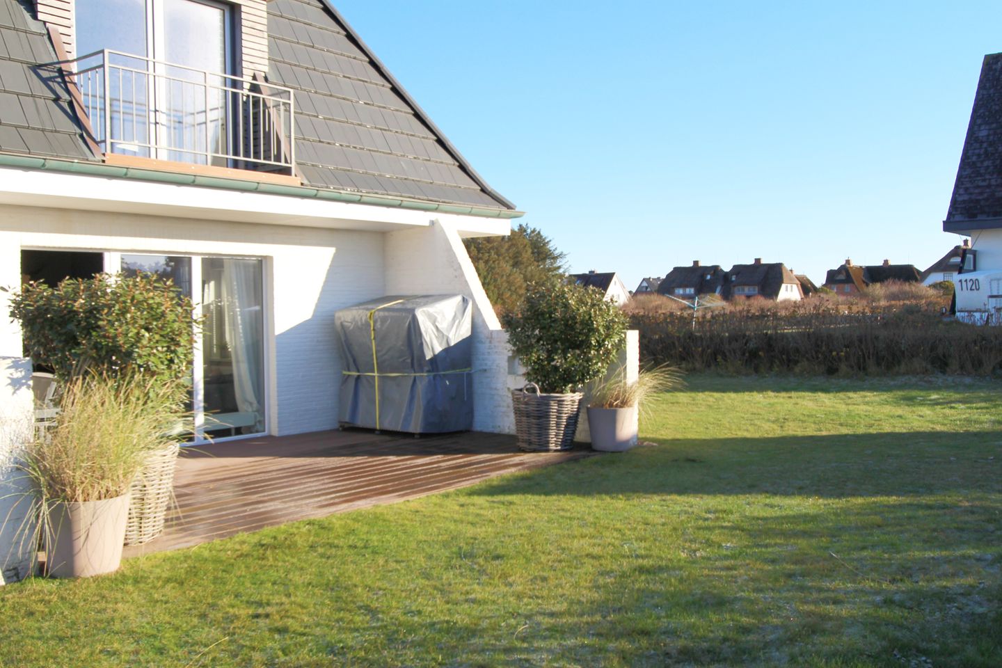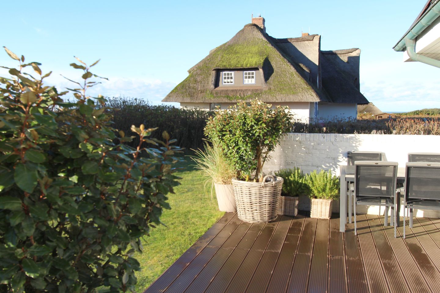 Auf der schönen Süd-Terrasse mit angrenzendem Garten genießen Sie die Sonne bei frischer Nordseeluft. Der eigene Strandkorb bietet auch am Tag höchstes Wohlbefinden und lässt Sie die Sorgen des Alltags vergessen.