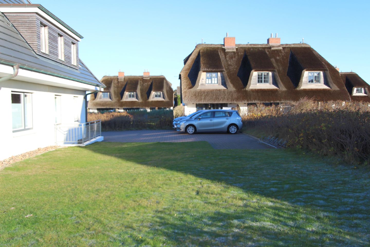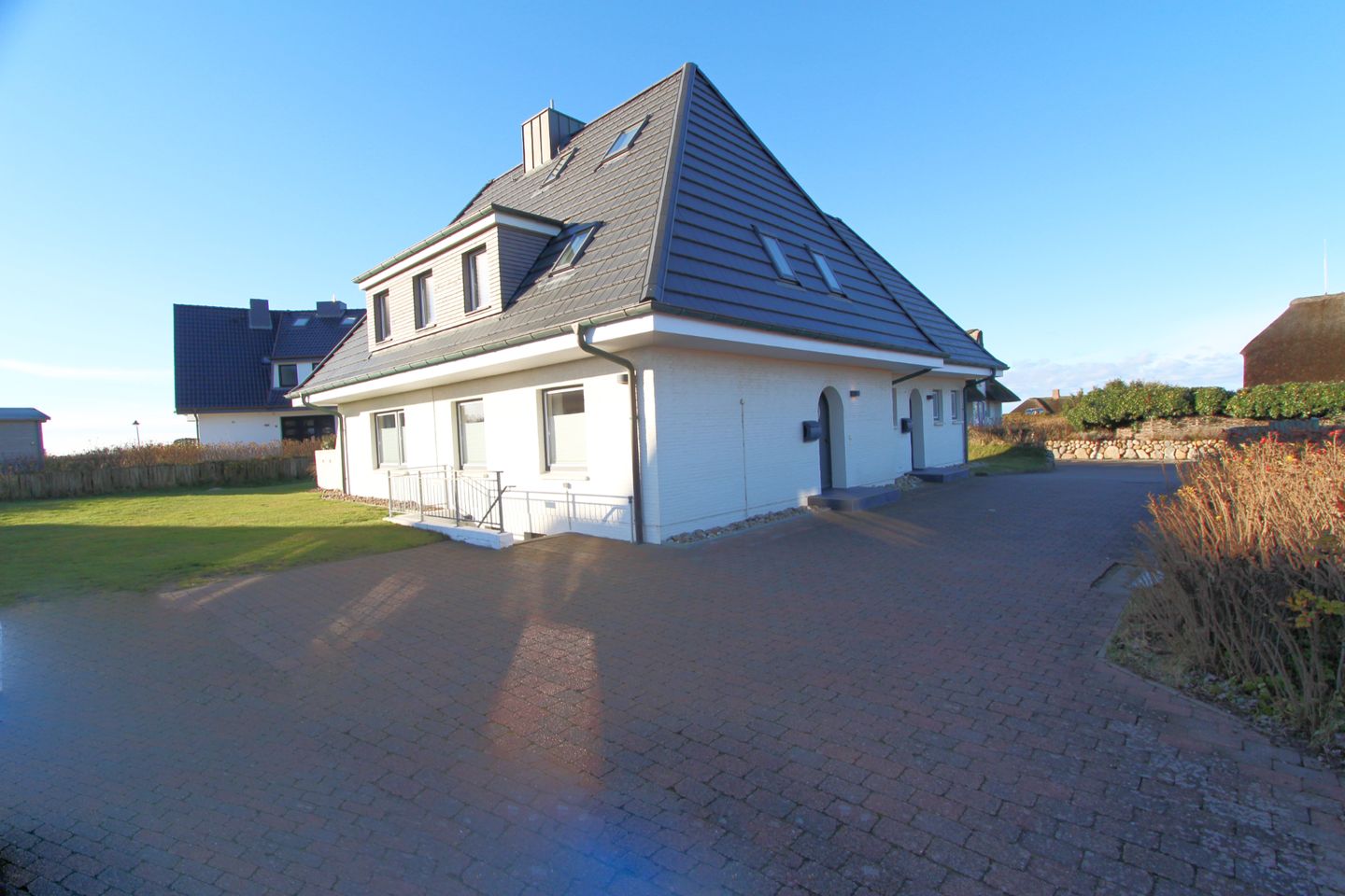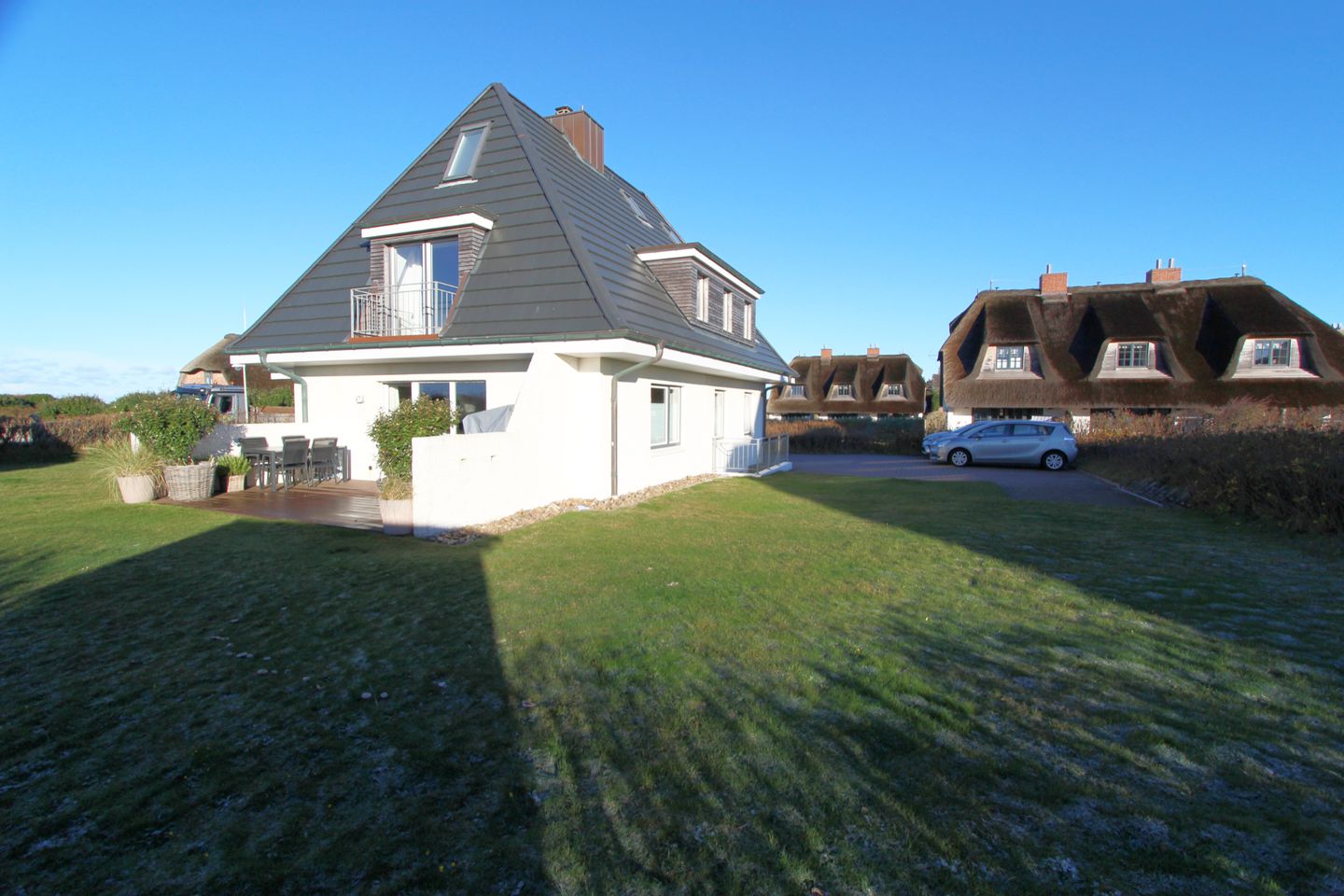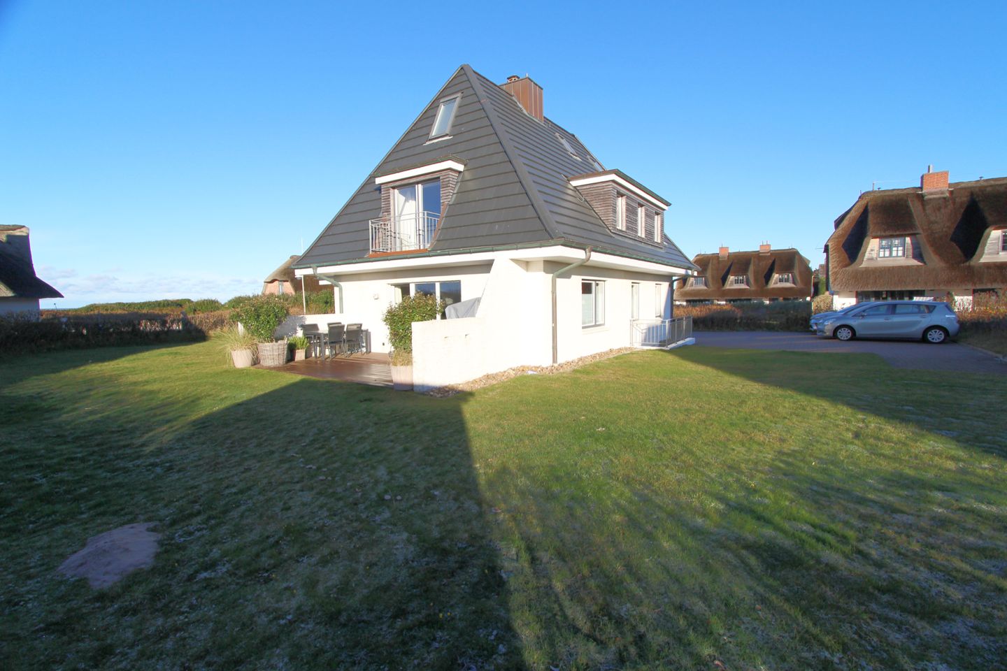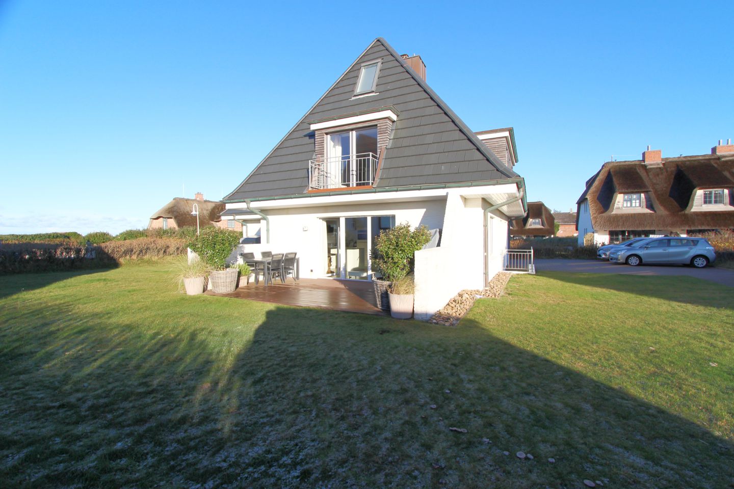 Auf der schönen Süd-Terrasse mit angrenzendem Garten genießen Sie die Sonne bei frischer Nordseeluft. Der eigene Strandkorb bietet auch am Tag höchstes Wohlbefinden und lässt Sie die Sorgen des Alltags vergessen.